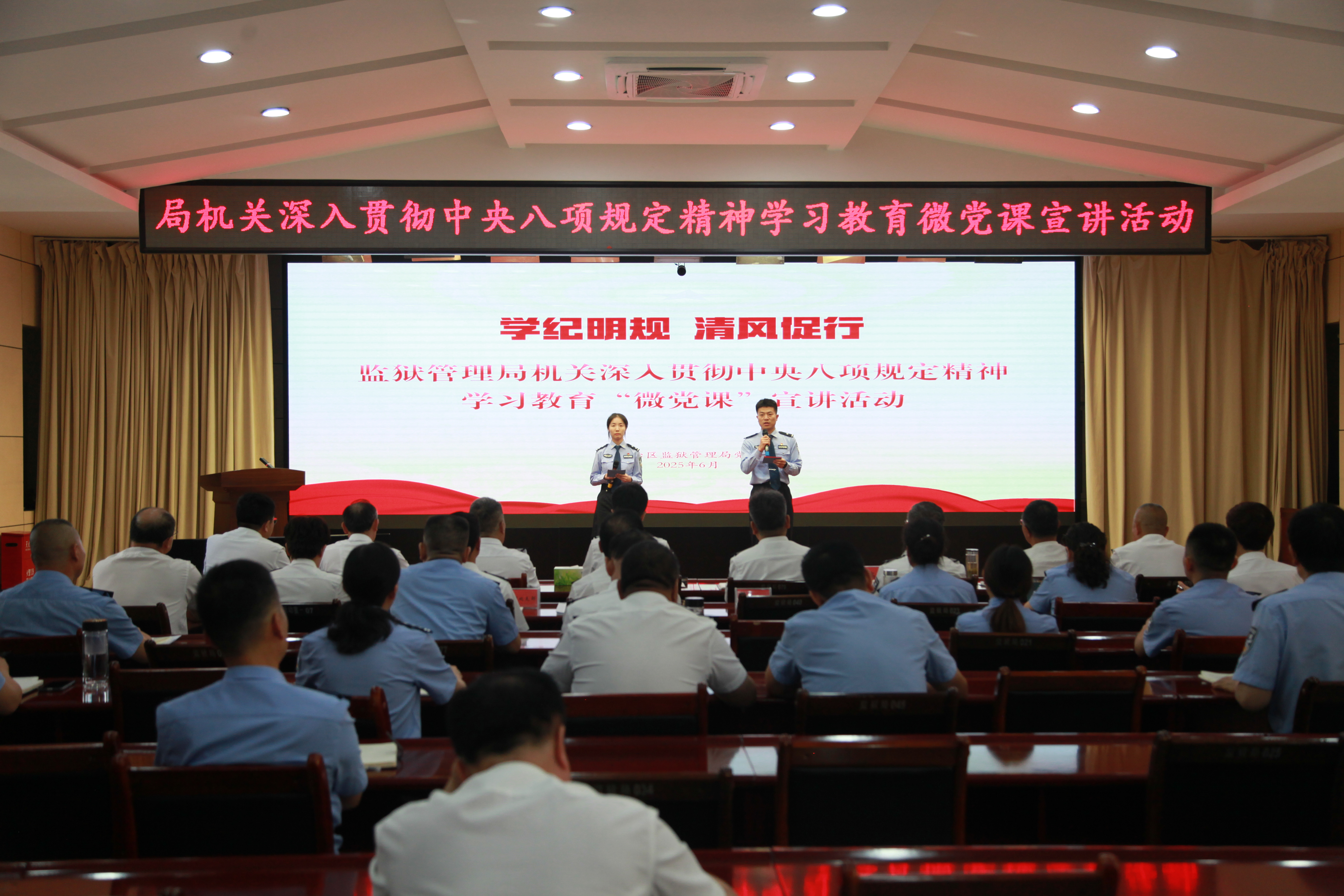 深入贯彻中央八项规定精神学习教育开展以来,自治区监狱管理局坚持以习近平新时代中国特色社会主义思想为指导,采取多种形式,组织党员干警职工认真学习领会习近平总书记关于加强党的作风建设的重要论述,学习领会和贯彻落实中央八项规定及其实施细则精神,推动学习教育入脑入心、见行见效。6月3日,自治区监狱管理局举办深入贯彻中央八项规定精神学习教育“微党课”宣讲活动。来自局机关和宁朔集团公司各党支部的13名党员紧扣“深入贯彻中央八项规定精神学习教育”主题,通过典型案例剖析、历史意义阐释、实践要求传导等维度,同台交流、以讲促学,为局机关全体党员干警带来一场生动形象的党性教育和作风锤炼“大餐”。局党委班子成员和局机关全体党员干警职工参加活动。